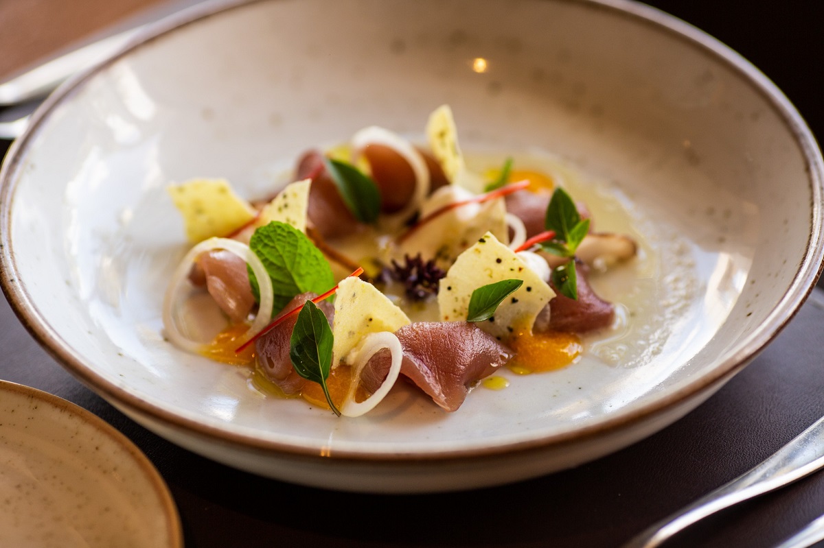 Carpaccio de atum com espuma de queijo e trufa, com mel de pimenta amarela