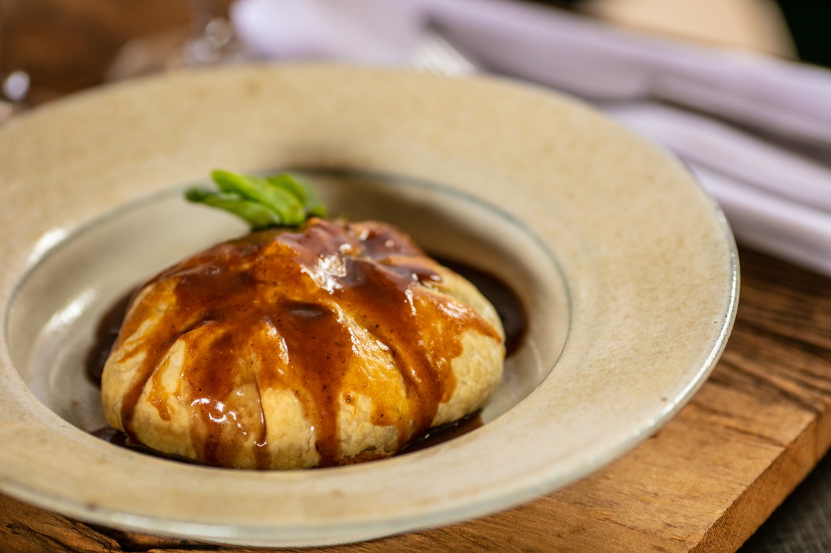 Filé mignon folhado com tomates assados, muçarela fresca, cebola confit, trufas e demi-glace