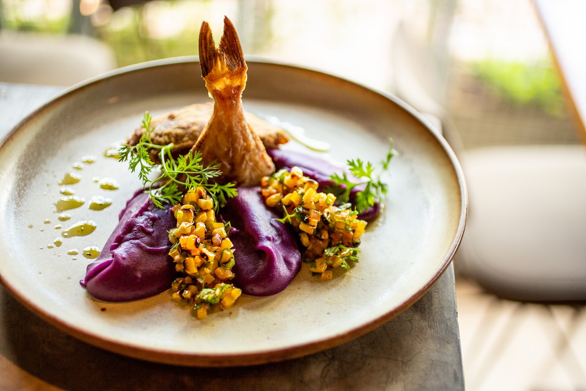 Peroá no fubá frito, purê de batata doce roxa com laranja, vinagrete de de milho tostado