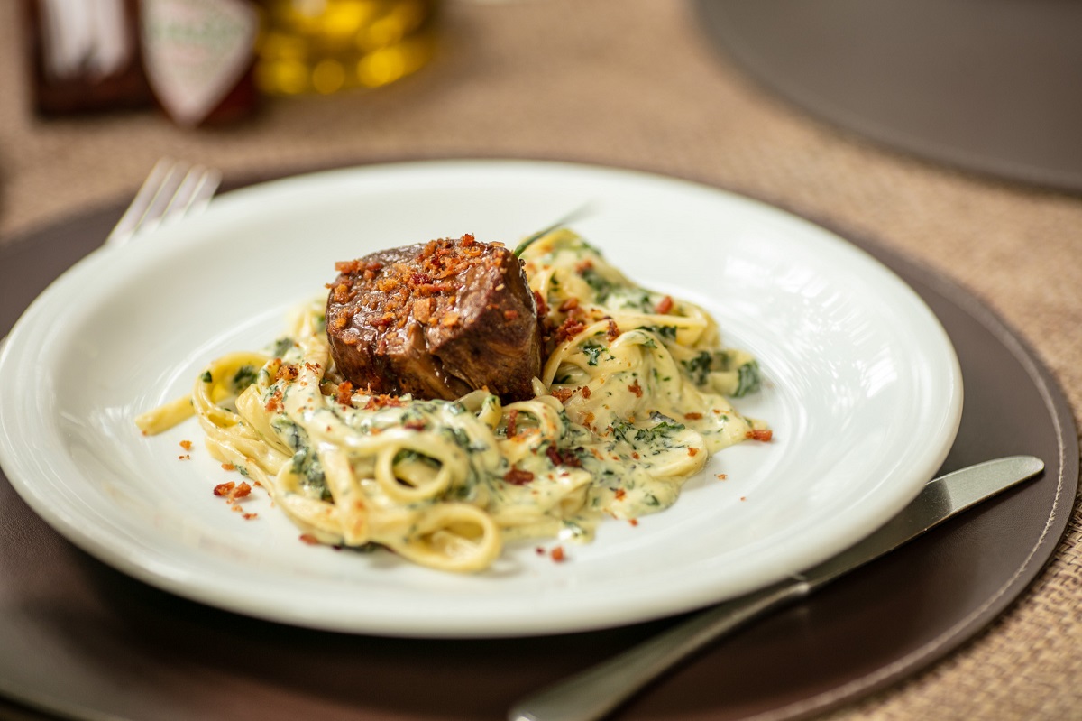 Tornedor de filé mignon servido sobre pasta longa ao molho de espinafre e gorgonzola e farofinha de bacon