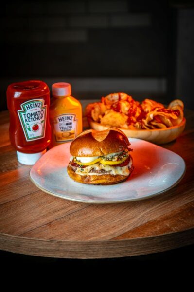 Inforno di Heinz – Burger na massa de pizza 48h feito com blend angus 160g, queijo cheddar, Mostarda Heinz Brown e bacon caramelizado na cerveja.