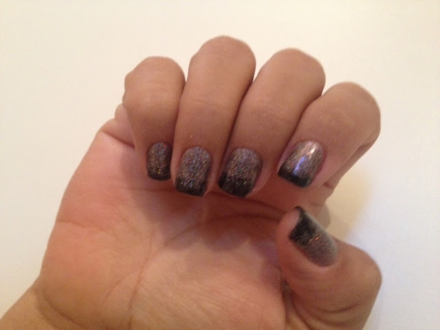 Depois disso tudo, passe o glitter. Se quiser, reforce o traço tipo “francesinha” na ponta.