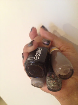 Primeiro, você vai precisar de três esmaltes da mesma família de cores. Eu sempre opto pelo Crochê (Impala) com Jackie (Impala) e um preto qualquer. Ah, também é necessário um glitter, pois ele ajuda a marca do encontro das cores.