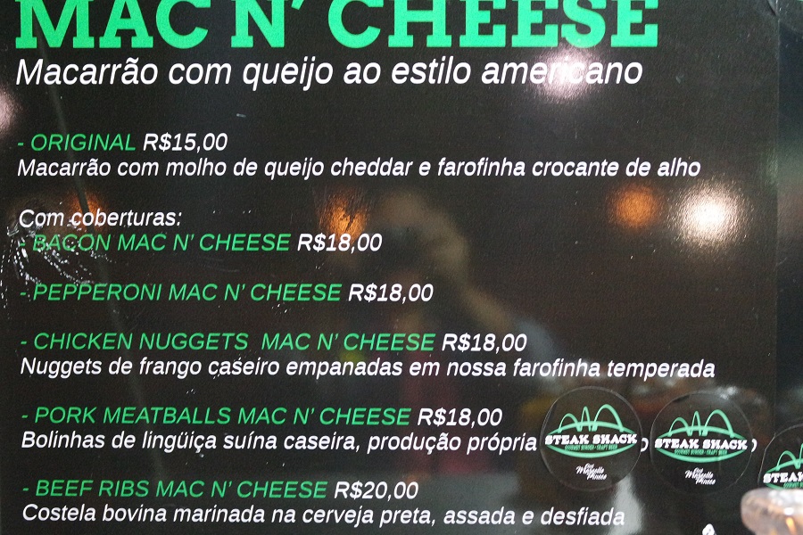 O menu conta ainda com versões de mac n´cheese, o macarrão clássico americano que vem inundado em queijo. A opção original (R$ 15) pode ser acrescida de bacon, pepperoni, peito de frango empanado ou bolinhas de linguiça suína (R$ 18) e ainda a mesma costela bovina servida no sanduíche (R$ 20).