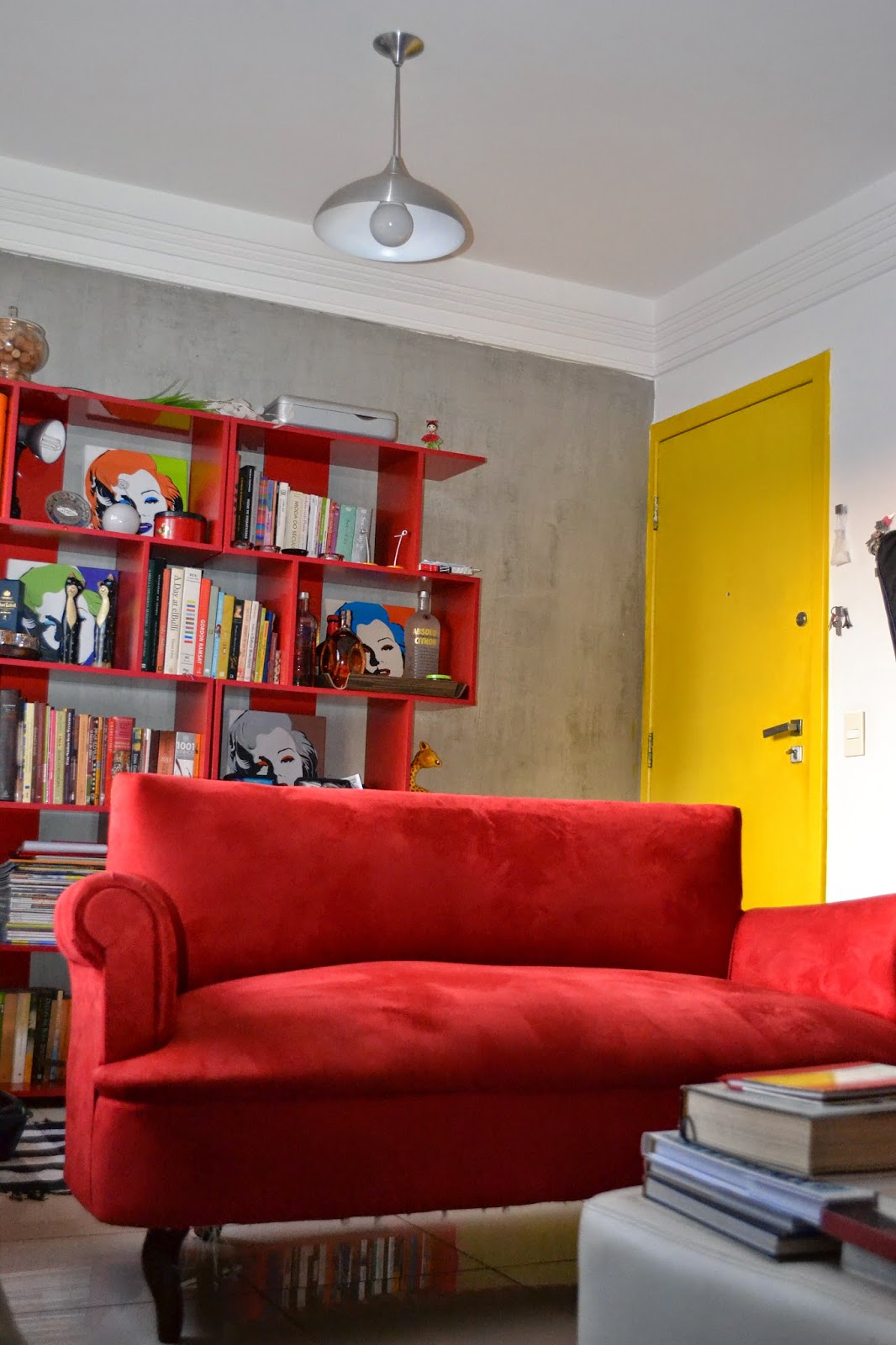 É como uma massa corrida, só que um pouco mais líquida. Tem de passar com espátula e num único sentido. Depois de seco, é preciso lixar, limpar e passar cera incolor, caso você queira dar um efeito liso. A aplicação é fácil. A parede atrás da estante vermelha eu mesma pintei.